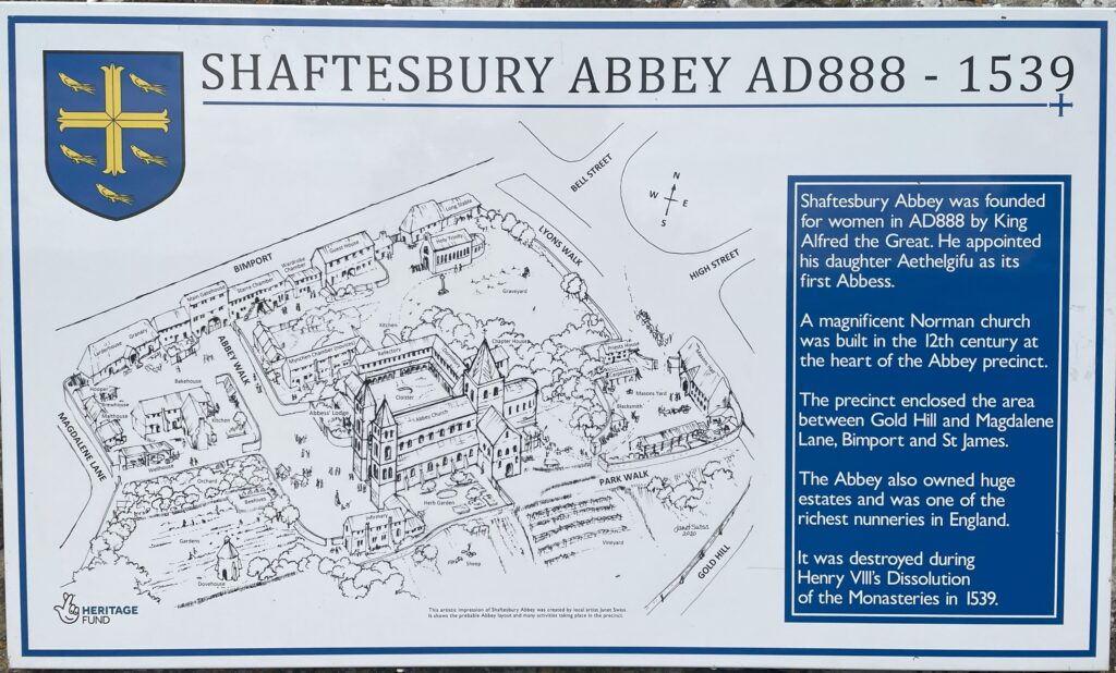 Shaftesbury Abbey pre-1539. The church in Cnut’s time would have been smaller, but it was still a large and wealthy abbey in the 11th century.